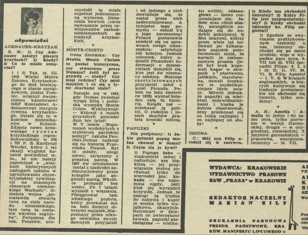 Archiwum / Skrzynka odpowiedzi nr 1027 (50/1964) 43150/123969 Podziel się Tytuł Odpowiedzi Rubryka Skrzynka odpowiedzi Artykuł z numeru 1027 (50/1964) Data wydania 13 grudnia 1964 Tagi odpowiedzi na pytania czytelników różności