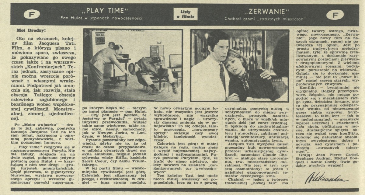 Archiwum / Listy o filmie nr 1392 (50/1971) 2/6 Podziel się Tytuł „Play time”, „Zerwanie” Autor Aleksandra Rubryka Listy o filmie Artykuł z numeru 1392 (50/1971) Data wydania 12 grudnia 1971 Tagi kinematografia francuska Jacques Tati komedia dramat thriller Claude Chabrol