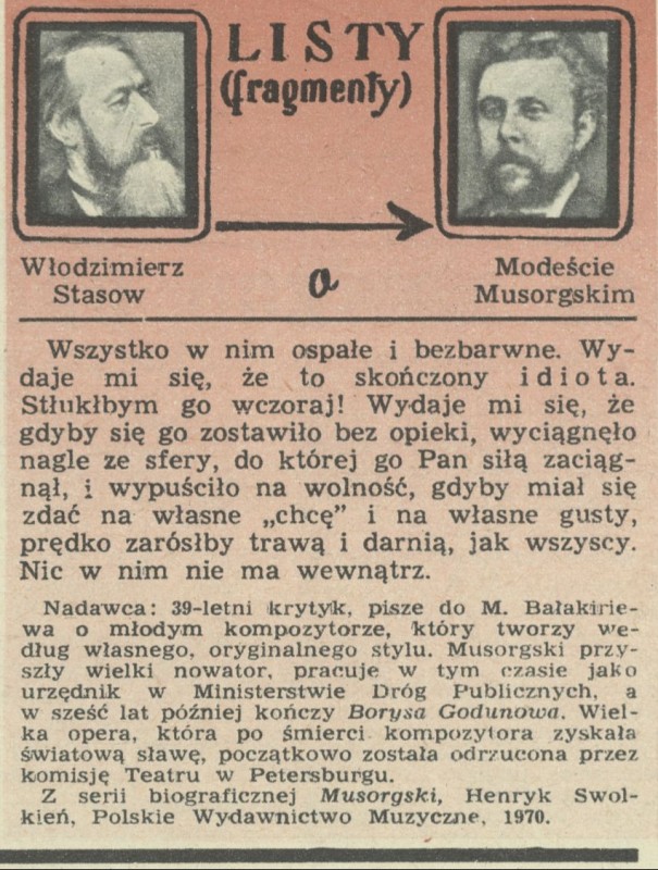 Archiwum / Listy sławnych ludzi nr 1392 (50/1971) 56658/123969 Podziel się Tytuł Listy (fragmenty) Włodzimierz Stasow o Modeście Musorgskim Rubryka Listy sławnych ludzi Artykuł z numeru 1392 (50/1971) Data wydania 12 grudnia 1971 Tagi muzyka kompozytor krytyk muzyczny