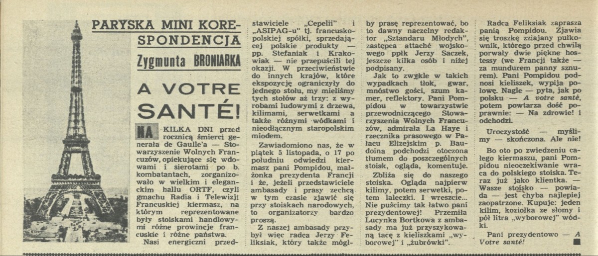 Archiwum / korespondencja własna "Przekroju" nr 1392 (50/1971) 79/84 Podziel się Tytuł À votre santé! Autor Zygmunt Broniarek Rubryka korespondencja własna "Przekroju" Artykuł z numeru 1392 (50/1971) Data wydania 12 grudnia 1971 Tagi Paryż wieża Eiffela de Gaulle Pompidou wódka