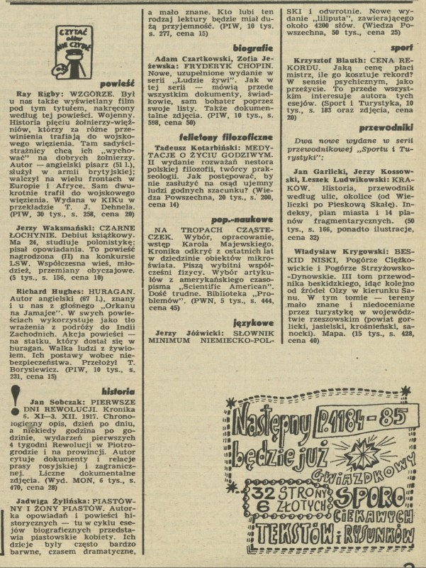 Archiwum / Czytać albo nie czytać? nr 1183 (50/1967) 1/1 Podziel się Tytuł Czytać albo nie czytać? Rubryka Czytać albo nie czytać? Artykuł z numeru 1183 (50/1967) Data wydania 10 grudnia 1967 Tagi Rigby Waksmański Hughes Blauth