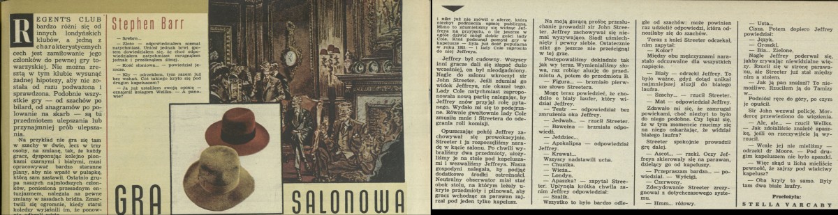 Archiwum / Opowiadanie nr 1393 (51/1971) 72/73 Podziel się Tytuł Gra salonowa Autor Stephen Barr Stella Varcaby Kategoria Opowiadanie Artykuł z numeru 1393 (51/1971) Data wydania 19 grudnia 1971