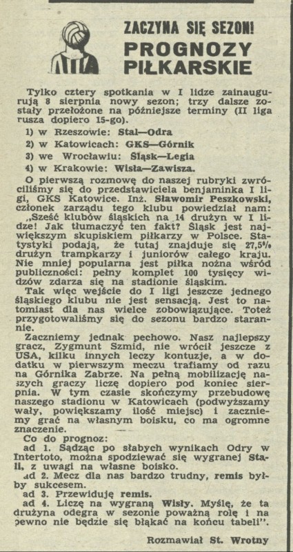 Archiwum / Piłkarskie prognozy nr 1061 (32/1965) 38/99 Podziel się Tytuł Prognozy piłkarskie Autor Stanisław Wrotny Rubryka Piłkarskie prognozy Artykuł z numeru 1061 (32/1965) Data wydania 7 sierpnia 1965