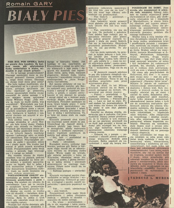 Archiwum / Opowiadanie nr 1356 (14/1971) 25/30 Podziel się Tytuł Biały pies Autor Romain Gary Tadeusz L. Murek Kategoria Opowiadanie Artykuł z numeru 1356 (14/1971) Data wydania 4 kwietnia 1971 Tagi Gary Romain biały pies opowiadanie proza
