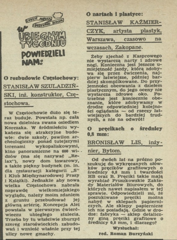 Archiwum / W ubiegłym tygodniu powiedzieli nam nr 933 (08/1963) 58/360 Podziel się Tytuł W ubiegłym tygodniu powiedzieli nam Autor Roman Burzyński Rubryka W ubiegłym tygodniu powiedzieli nam Artykuł z numeru 933 (8/1963) Data wydania 24 lutego 1963 Tagi rozbudowa Częstochowa narty plastyka różności