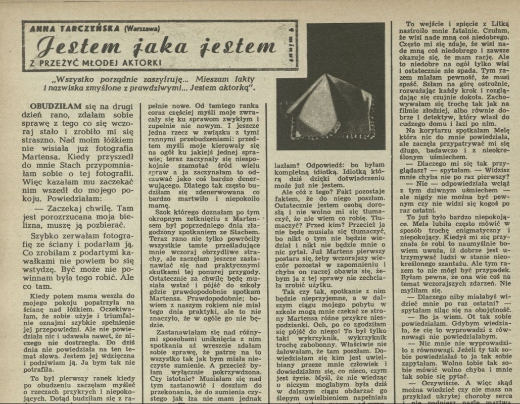 Archiwum / Proza nr 933 (08/1963) 39135/123969 Podziel się Tytuł Jestem jaka jestem - z przeżyć młodej aktorki Autor Anna Tarczyńska Kategoria Proza Artykuł z numeru 933 (8/1963) Data wydania 24 lutego 1963 Tagi życie młodej aktorki proza