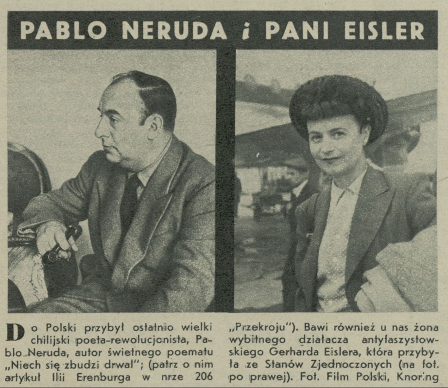 Archiwum / Różności nr 222 (28/1949) 230/2096 Podziel się Tytuł Pablo Neruda i Pani Eisler Kategoria Różności Artykuł z numeru 222 (28/1949) Data wydania 10 lipca 1949 Tagi Pablo Neruda Gerhard Eisler