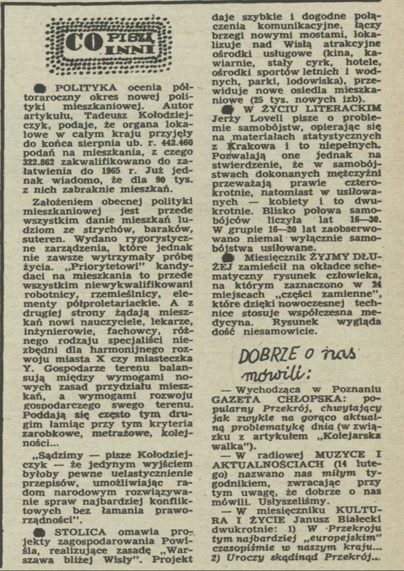 Archiwum / Co piszą inni nr 934 (09/1963) 39173/123969 Podziel się Tytuł Co piszą inni Rubryka Co piszą inni Artykuł z numeru 934 (9/1963) Data wydania 3 marca 1963 Tagi nowa polityka mieszkaniowa samobójstwa różności