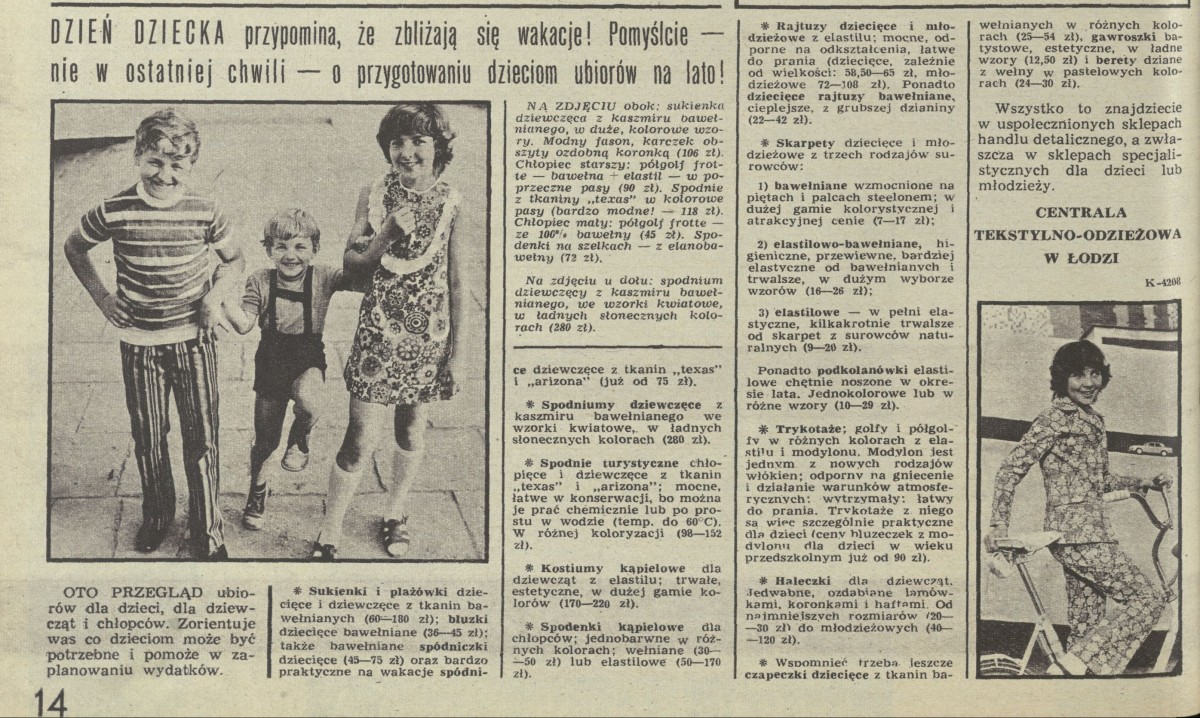 Archiwum / Społeczeństwo nr 1364 (22/1971) 05/28 Podziel się Tytuł Dzień dziecka Kategoria Społeczeństwo Artykuł z numeru 1364 (22/1971) Data wydania 30 maja 1971 Tagi Łódź Centrala Tekstylno-Odzieżowa dzieci ubiór