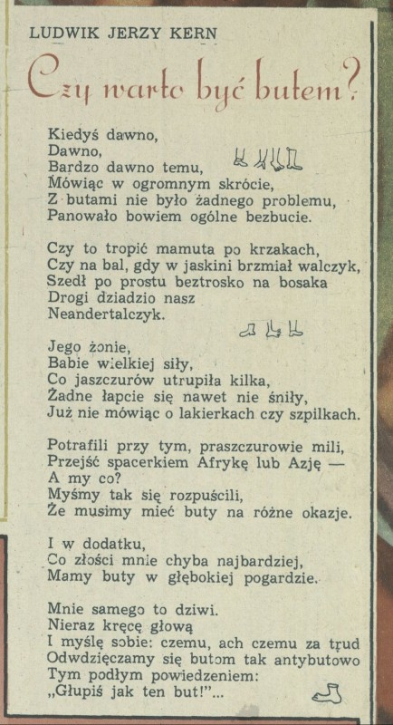 Archiwum / Poezja nr 1364 (22/1971) 37/97 Podziel się Tytuł Czy warto być butem? Autor Ludwik Jerzy Kern Kategoria Poezja Artykuł z numeru 1364 (22/1971) Data wydania 30 maja 1971 Tagi Ludwik Jerzy Kern poezja