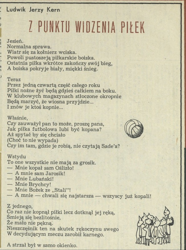 Archiwum / Rozmaitości [old] nr 1284 (46/1969) 20/24 Podziel się Tytuł Z punktu widzenia piłek Autor Ludwik Jerzy Kern Rubryka Rozmaitości [old] Artykuł z numeru 1284 (46/1969) Data wydania 16 listopada 1969 Tagi Jesień piłki