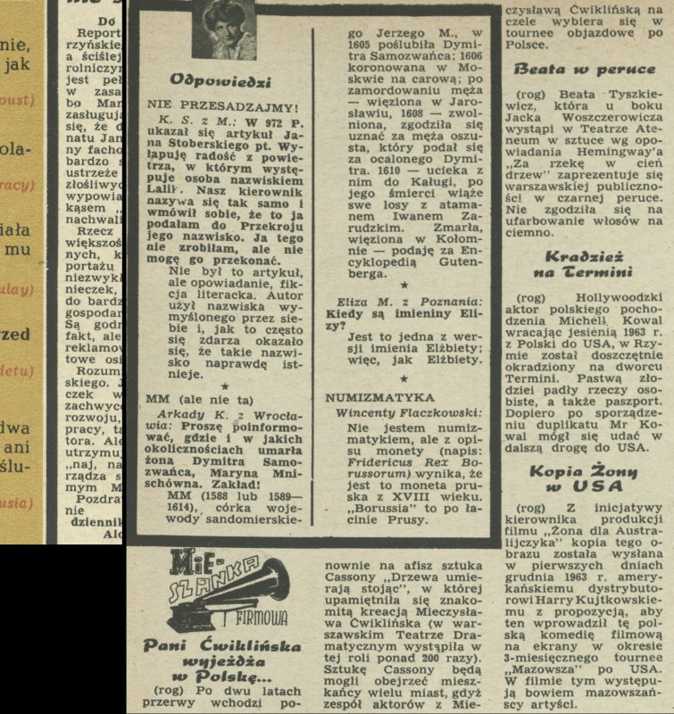 Archiwum / Mieszanka firmowa nr 978 (01/1964) 11/15 Podziel się Tytuł Mieszanka firmowa Autor ROG Rubryka Mieszanka firmowa Artykuł z numeru 978 (1/1964) Data wydania 5 stycznia 1964 Tagi mieszanka firmowa różności Beata Tyszkiewicz Mieczysława Cwiklińska