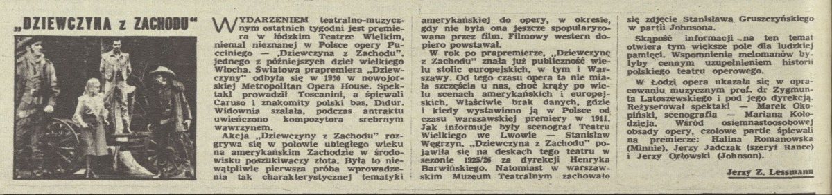 Archiwum / Komentarz nr 1365 (23/1971) 1/1 Podziel się Tytuł „Dziewczyna z Zachodu” Autor Jerzy Z. Lessman Kategoria Komentarz Artykuł z numeru 1365 (23/1971) Data wydania 6 czerwca 1971 Tagi Teatr Wielki Dziewczyna z Zachodu Halina Romanowska