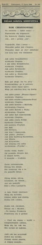 Archiwum / Pigułki - organ Janusza Minkiewicza nr 223 (29/1949) 6829/123969 Podziel się Tytuł Rok Chopinowski Autor Janusz Minkiewicz Rubryka Pigułki - organ Janusza Minkiewicza Artykuł z numeru 223 (29/1949) Data wydania 17 lipca 1949 Tagi wiersz Chopin muzyka