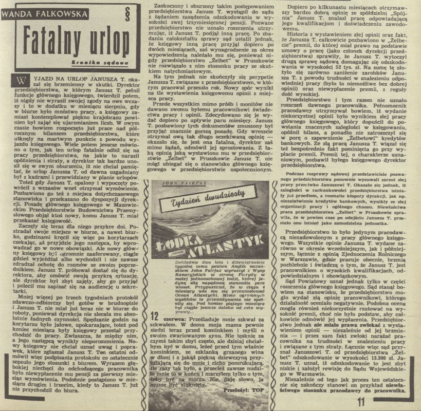 Archiwum / Kronika sądowa nr 1365 (23/1971) 1/3 Podziel się Tytuł Kronika sądowa: fatalny urlop Autor Wanda Falkowska Rubryka Kronika sądowa Artykuł z numeru 1365 (23/1971) Data wydania 6 czerwca 1971 Tagi kronika sądowa Wanda Falkowska