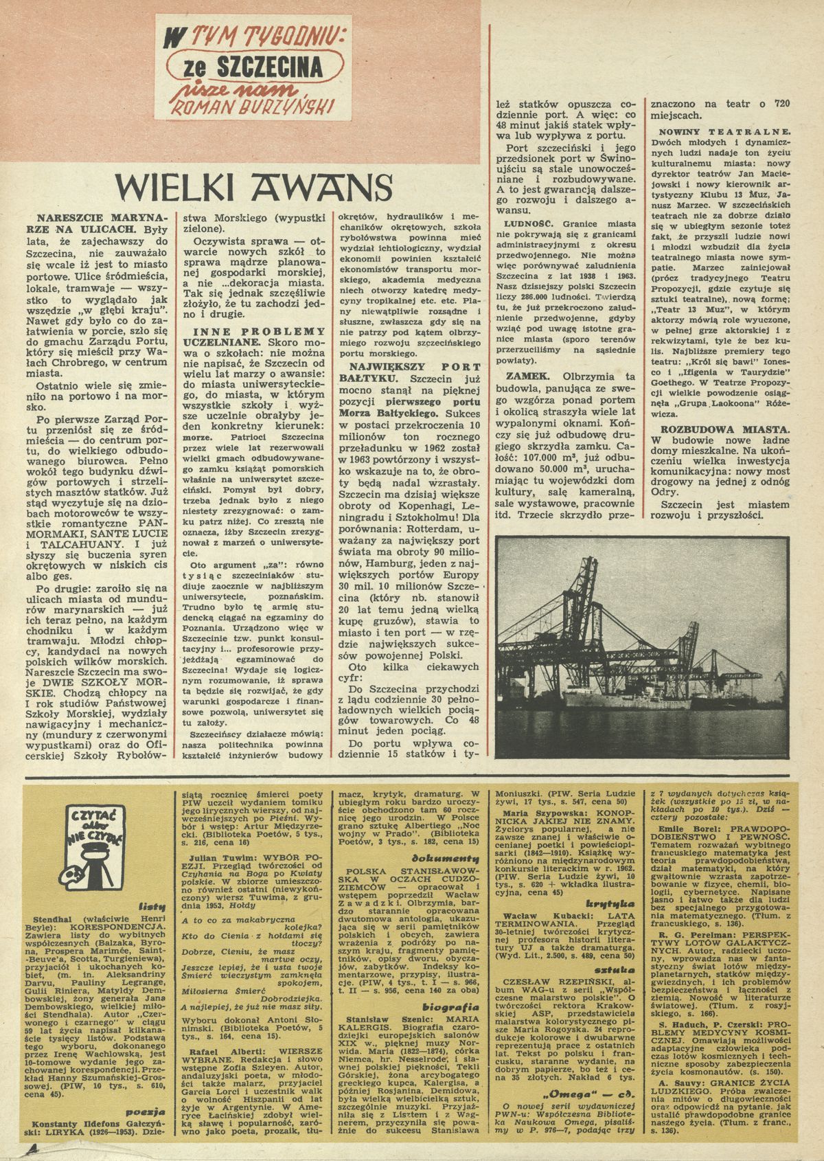 Archiwum / Okładki Przekroju nr 979 (02/1964) 41119/123969 Podziel się Tytuł W tym tygodniu: ze Szczecina pisze nam Roman Burzyński Autor Roman Burzyński Rubryka Okładki Przekroju Artykuł z numeru 979 (2/1964) Data wydania 12 stycznia 1964 Tagi Szczecin zwiedzanie relacja