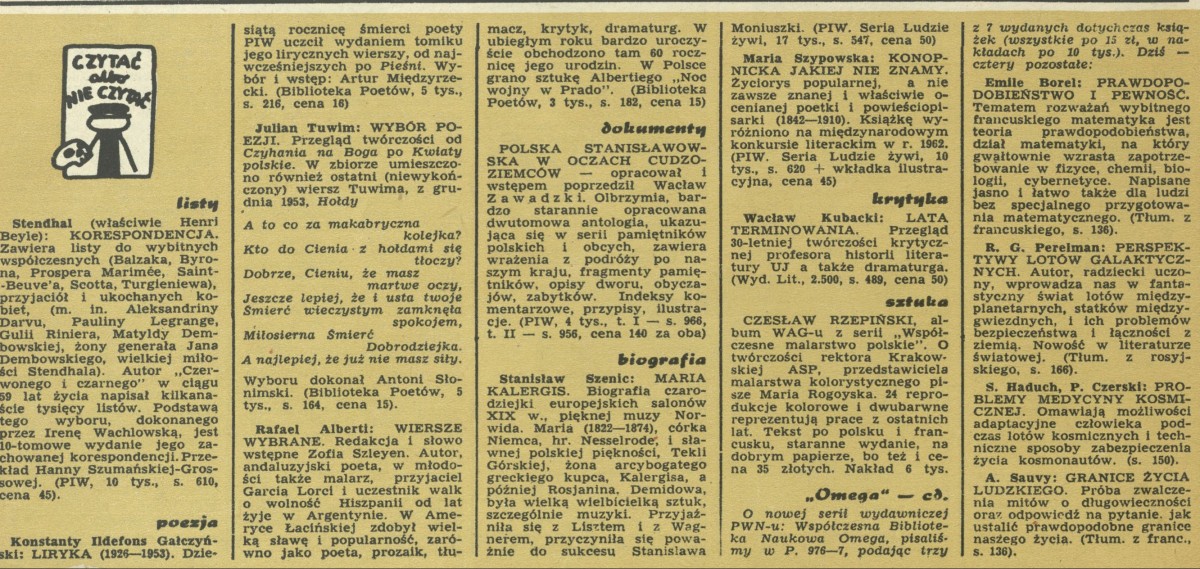 Archiwum / Czytać albo nie czytać? nr 979 (02/1964) 2/9 Podziel się Tytuł Czytać albo nie czytać Rubryka Czytać albo nie czytać? Artykuł z numeru 979 (2/1964) Data wydania 12 stycznia 1964 Tagi Stendhal K.I. Gałczyński Tuwim