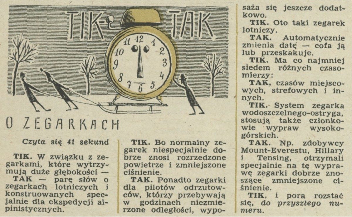 Archiwum / Różności nr 980 (03/1964) 41173/123969 Podziel się Tytuł O zegarkach Kategoria Różności Artykuł z numeru 980 (3/1964) Data wydania 19 stycznia 1964 Tagi zegarki lotnicze ekspedycje alpinistyczne różności