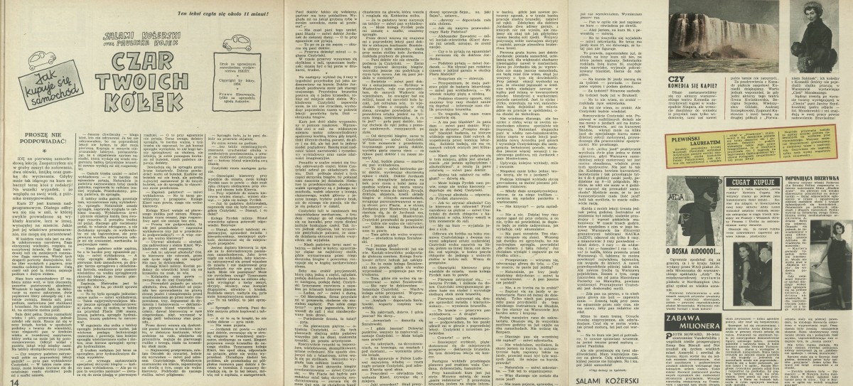Archiwum / Czar Twoich kółek nr 731 (15/1959) 29859/123969 Podziel się Tytuł Czar twoich kółek Autor Rojek Paulinka Kożerski Salami Rubryka Czar Twoich kółek Artykuł z numeru 731 (15/1959) Data wydania 12 kwietnia 1959