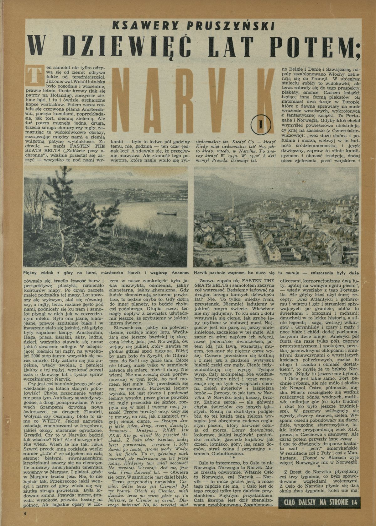 Archiwum / korespondencja własna "Przekroju" nr 225 (31/1949) 143/157 Podziel się Tytuł W dziewięć lat potem; Narvik Autor Ksawer Pruszyński Rubryka korespondencja własna "Przekroju" Artykuł z numeru 225 (31/1949) Data wydania 31 lipca 1949 Tagi podróże Oslo Narvik Norwegia