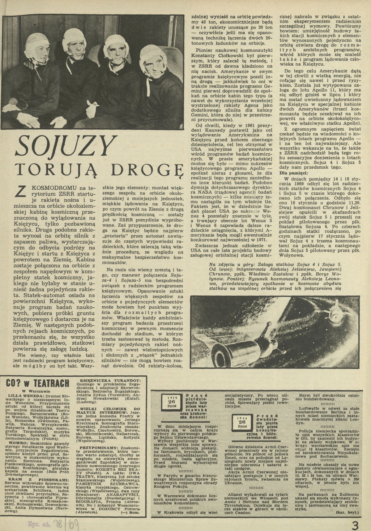 Archiwum / Społeczeństwo nr 1242 (04/1969) 3/4 Podziel się Tytuł Sojuzy torują drogę Kategoria Społeczeństwo Artykuł z numeru 1242 (4/1969) Data wydania 26 stycznia 1969