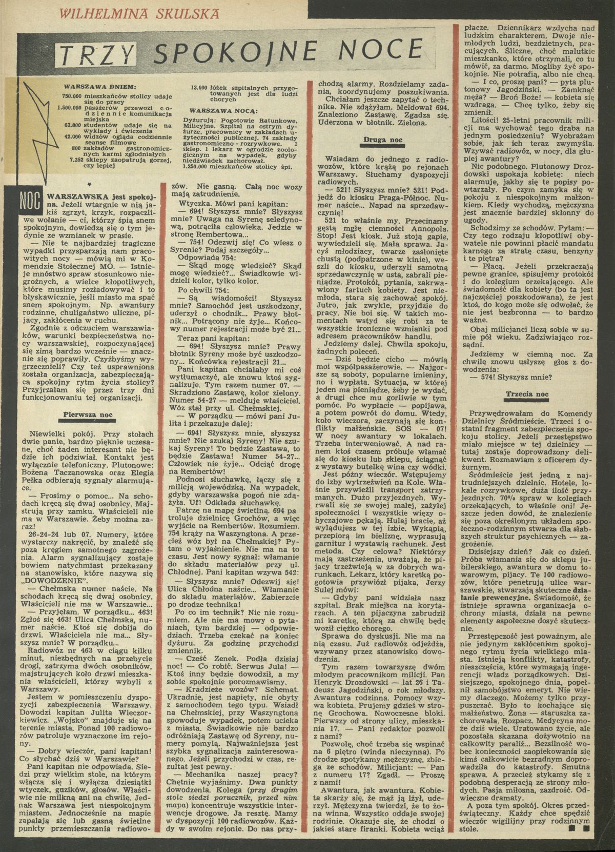 Archiwum / Reportaż nr 1242 (04/1969) 51207/123969 Podziel się Tytuł Trzy spokojne noce Autor Skulska Wilelmina Kategoria Reportaż Artykuł z numeru 1242 (4/1969) Data wydania 26 stycznia 1969 Tagi Warszawa
