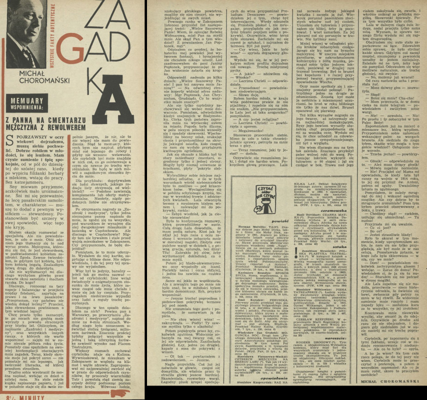 Archiwum / Opowiadanie nr 982 (05/1964) 41252/123969 Podziel się Tytuł Zagadka. Memuary wspomnienia: Z panną na cmentarzu mężczyzna z rewolwerem Autor Michał Choromański Kategoria Opowiadanie Artykuł z numeru 982 (5/1964) Data wydania 2 lutego 1964
