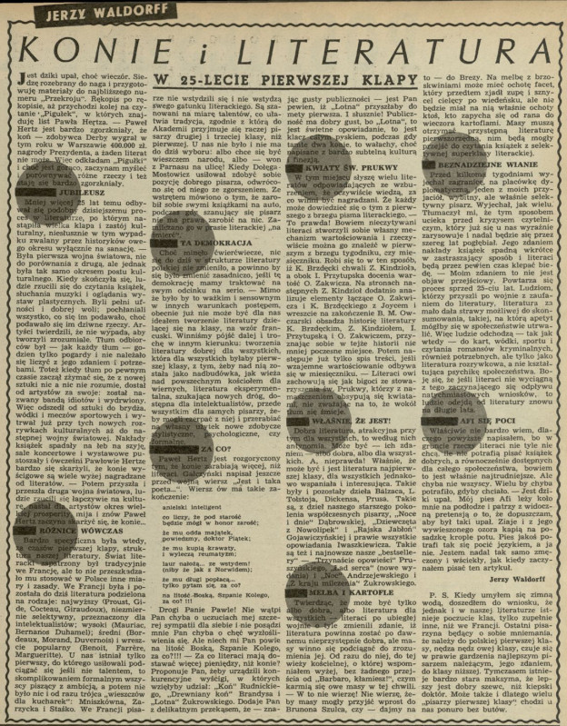 Archiwum / Felieton nr 119 (29/1947) 83/1254 Podziel się Tytuł Konie i literatura. W 25–lecie pierwsze klapy Autor Jerzy Waldorff Kategoria Felieton Artykuł z numeru 119 (29/1947) Data wydania 20 lipca 1947 Tagi literatura książki