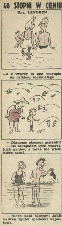 Archiwum / Historyjki obrazkowe nr 119 (29/1947) 13/139 Podziel się Tytuł 40 stopni w cieniu Autor Zbigniew Lengren Kategoria Historyjki obrazkowe Artykuł z numeru 119 (29/1947) Data wydania 20 lipca 1947 Tagi żart rysunkowy plaża wakacje lato