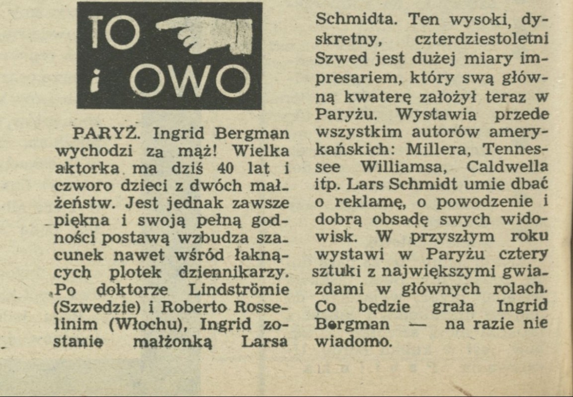 Archiwum / To i owo nr 694 (30/1958) 28302/123969 Podziel się Tytuł To i owo Rubryka To i owo Artykuł z numeru 694 (30/1958) Data wydania 27 lipca 1958