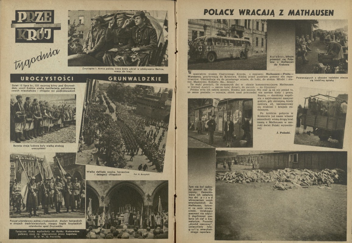Archiwum / Przekrój tygodnia nr 15 (15/1945) 15/3219 Podziel się Tytuł Przekrój tygodnia Autor J. Podoski Rubryka Przekrój tygodnia Artykuł z numeru 15 (15/1945) Data wydania 22 lipca 1945 Tagi Uroczystości Grunwaldzkie Polacy wracają z Mathausen