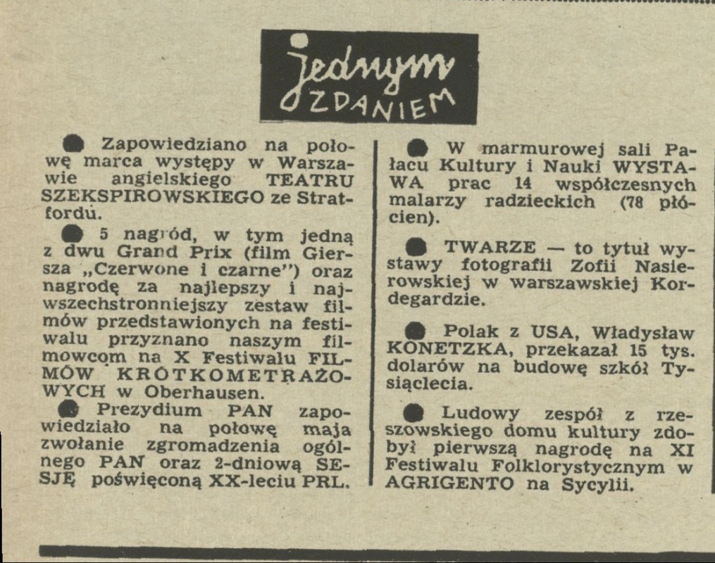 Archiwum / Jednym zdaniem nr 985 (08/1964) 41387/123969 Podziel się Tytuł Jednym zdaniem Rubryka Jednym zdaniem Artykuł z numeru 985 (8/1964) Data wydania 23 lutego 1964 Tagi Teatr Szekspirowski wystawa malarstwa Pałac Kultury i Nauki