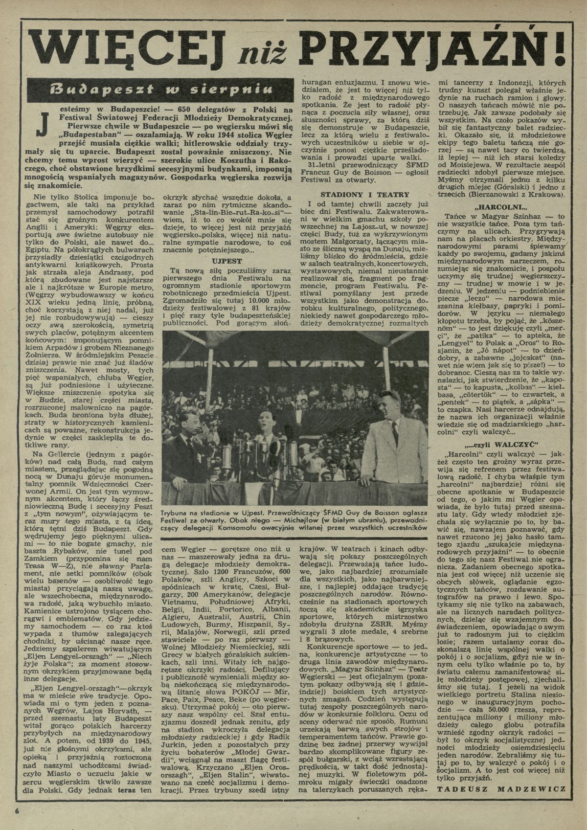 Archiwum / Społeczeństwo nr 230 (36/1949) 92/94 Podziel się Tytuł Więcej niż przyjaźń! Budapeszt w sierpniu Autor Tadeusz Madzewicz Kategoria Społeczeństwo Artykuł z numeru 230 (36/1949) Data wydania 4 września 1949 Tagi Festiwal Światowej Federacji Młodzieży Demokratycznej Budapeszt Węgry