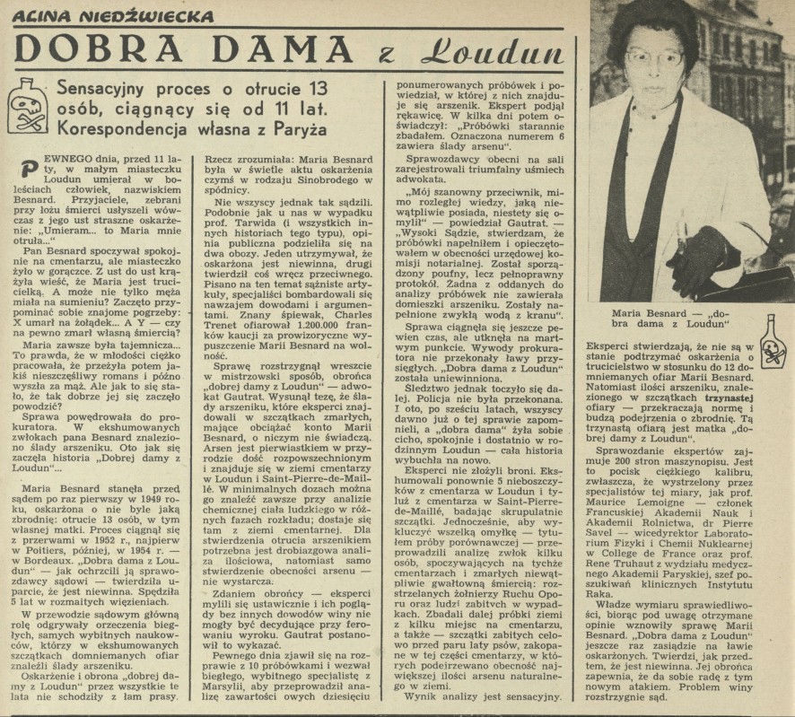 Archiwum / korespondencja własna "Przekroju" nr 801 (33/1960) 07/328 Podziel się Tytuł Dobra dama z Loudun Autor Alina Niedżwiecka Rubryka korespondencja własna "Przekroju" Artykuł z numeru 801 (33/1960) Data wydania 14 sierpnia 1960 Tagi trucizna otrucie Maria Besnard morderczyni