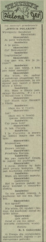 Archiwum / Teatrzyk Zielona Gęś nr 63 (25/1946) 17/74 Podziel się Tytuł Dwóch polaków Autor Konstanty Ildefons Gałczyński Rubryka Teatrzyk Zielona Gęś Artykuł z numeru 63 (25/1946) Data wydania 23 czerwca 1946