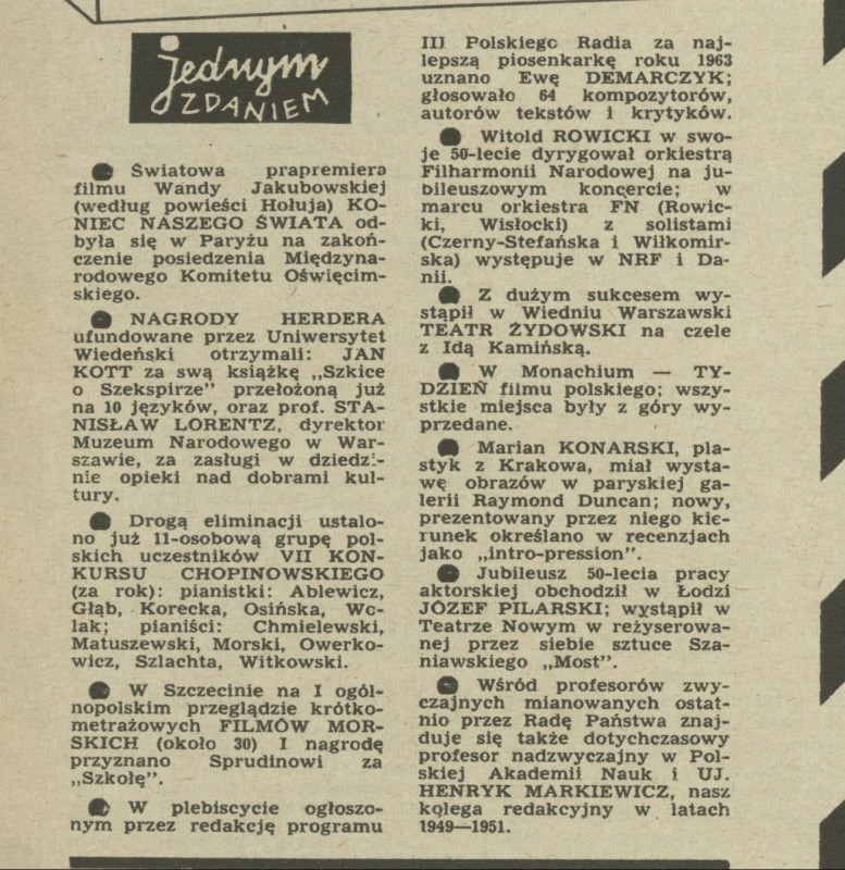 Archiwum / Jednym zdaniem nr 987 (10/1964) 41480/123969 Podziel się Tytuł Jednym zdaniem Rubryka Jednym zdaniem Artykuł z numeru 987 (10/1964) Data wydania 8 marca 1964 Tagi VII Konkurs Chopinowski Teatr Żydowski Ewa Demarczyk