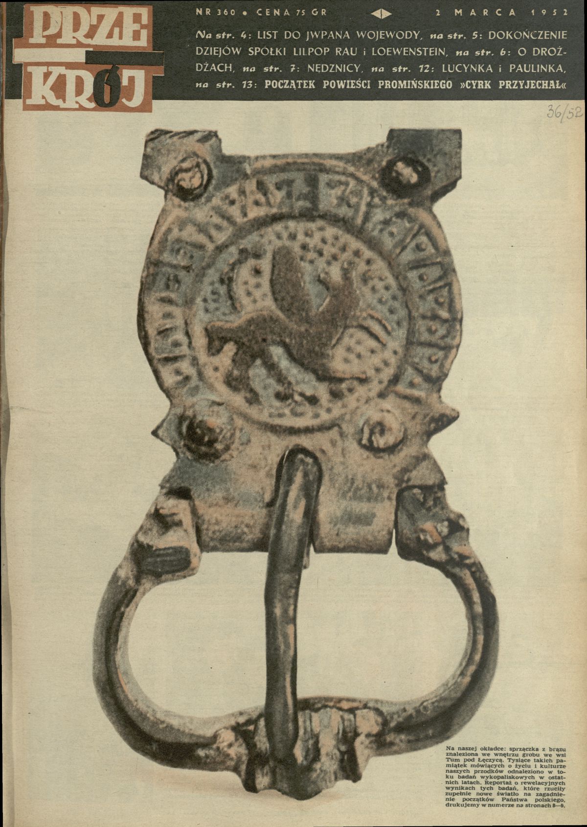 Archiwum / Okładki Przekroju nr 360 (09/1952) 357/2505 Podziel się Tytuł Okładka Rubryka Okładki Przekroju Artykuł z numeru 360 (9/1952) Data wydania 2 marca 1952 Tagi sprzączka z brązu Tum pod Łęczycą archeologia wykopaliska wczesnośredniowieczny gród książęcy