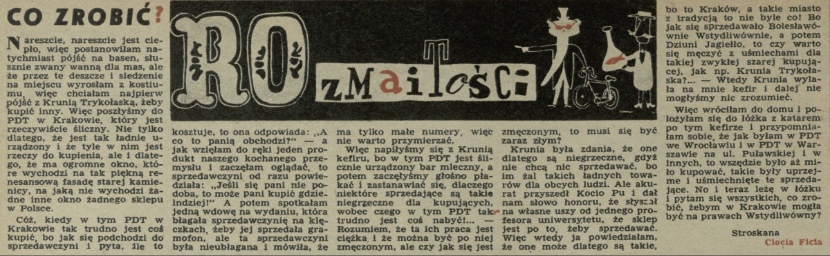 Archiwum / Rozmaitości [old] nr 230 (36/1949) 7078/123969 Podziel się Tytuł Co zrobić? Autor Ficia Ciocia Rubryka Rozmaitości [old] Artykuł z numeru 230 (36/1949) Data wydania 4 września 1949