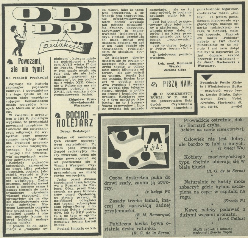 Archiwum / Listy do i od redakcji nr 1266 (28/1969) 26/43 Podziel się Tytuł [Powozami, ale nie tymi!] Rubryka Listy do i od redakcji Artykuł z numeru 1266 (28/1969) Data wydania 13 lipca 1969 Tagi Bocian powozy
