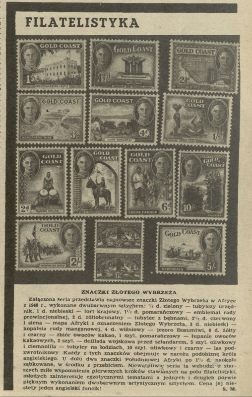 Archiwum / Filatelistyka nr 208 (14/1949) 6394/123969 Podziel się Tytuł Filatelistyka Rubryka Filatelistyka Artykuł z numeru 208 (14/1949) Data wydania 3 kwietnia 1949 Tagi znaczki pocztowe Złote Wybrzeże Gold Coast