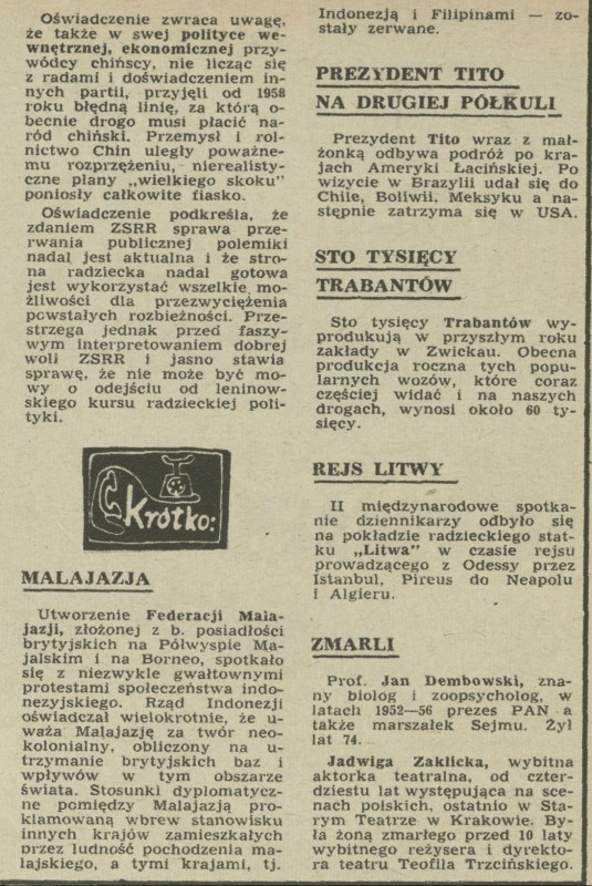 Archiwum / Krótko nr 964 (39/1963) 201/286 Podziel się Tytuł Krótko Rubryka Krótko Artykuł z numeru 964 (39/1963) Data wydania 29 września 1963 Tagi trabanty Malazja różności