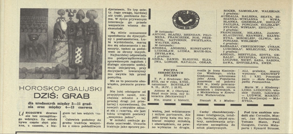 Archiwum / Różności nr 1390 (48/1971) 56588/123969 Podziel się Tytuł Horoskop galijski Kategoria Różności Artykuł z numeru 1390 (48/1971) Data wydania 28 listopada 1971 Tagi horoskop horoskop galijski grab