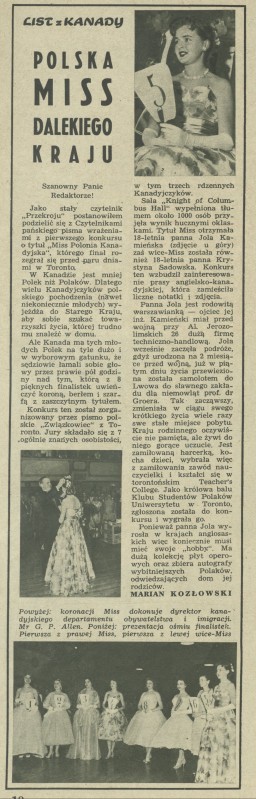 Archiwum / Korespondencja nr 690 (26/1958) 25/57 Podziel się Tytuł Polska miss dalekiego kraju Autor Marian Kozłowski Kategoria Korespondencja Artykuł z numeru 690 (26/1958) Data wydania 29 czerwca 1958 Tagi miss Kanada