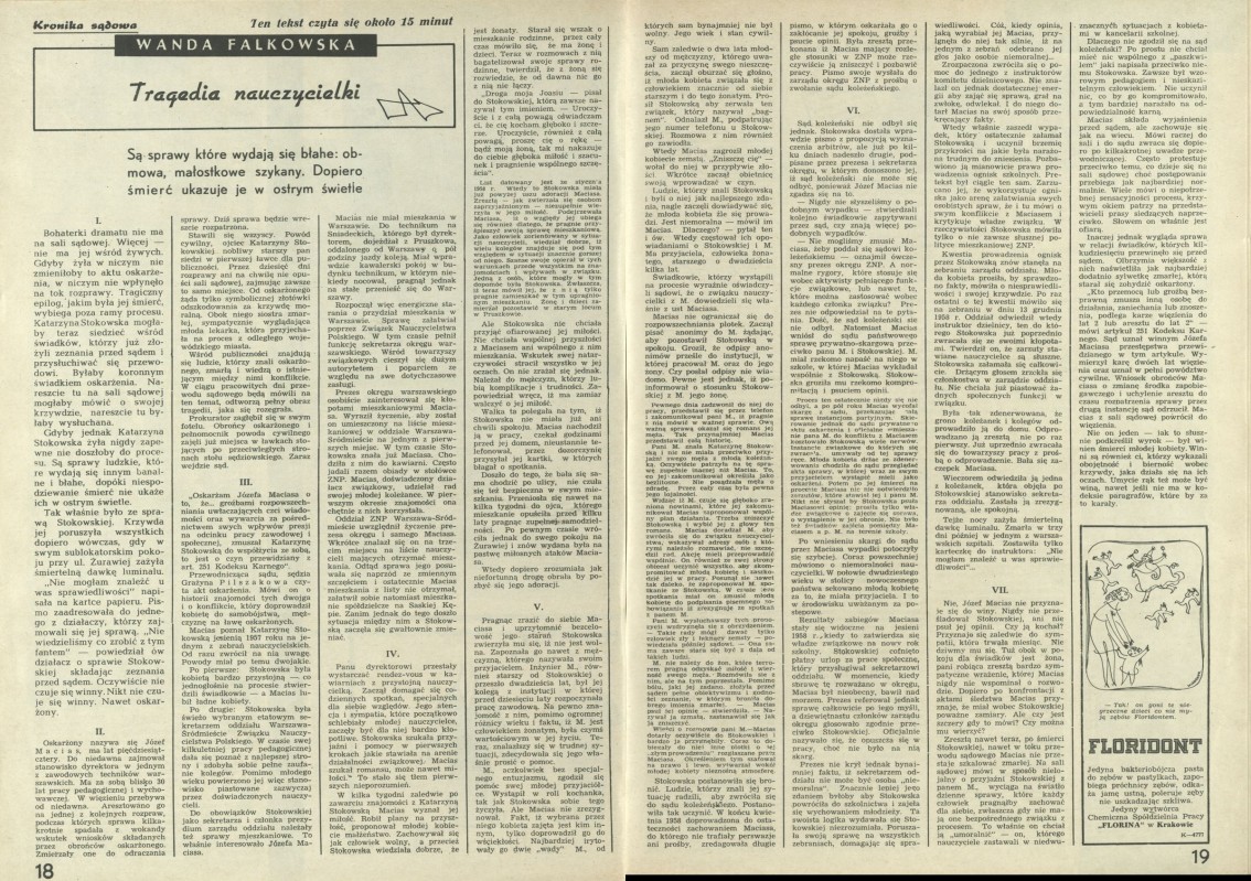 Archiwum / Kronika sądowa nr 744 (28/1959) 29/39 Podziel się Tytuł Tragedia nauczycielki Autor Wanda Falkowska Rubryka Kronika sądowa Artykuł z numeru 744 (28/1959) Data wydania 12 lipca 1959