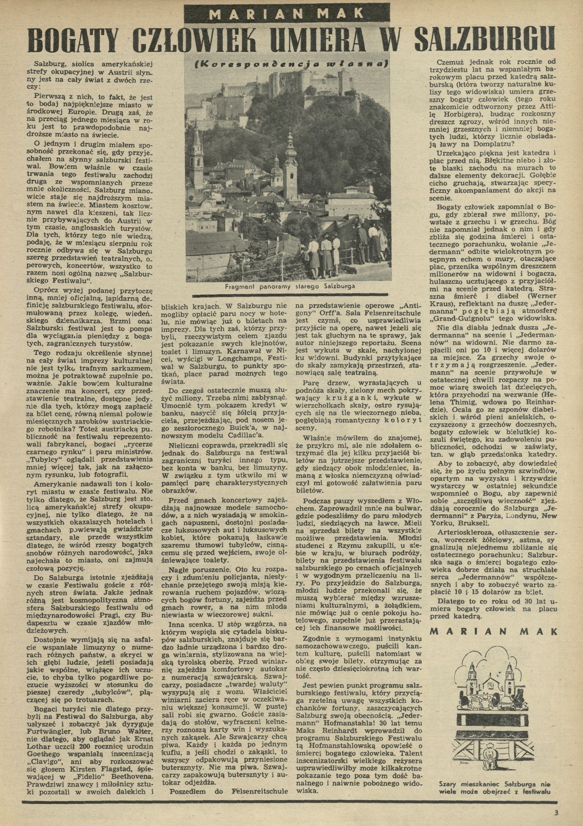 Archiwum / korespondencja własna "Przekroju" nr 241 (47/1949) 155/157 Podziel się Tytuł Bogaty człowiek umiera w Salzburgu Autor Marian Mak Rubryka korespondencja własna "Przekroju" Artykuł z numeru 241 (47/1949) Data wydania 20 listopada 1949 Tagi Salzburg