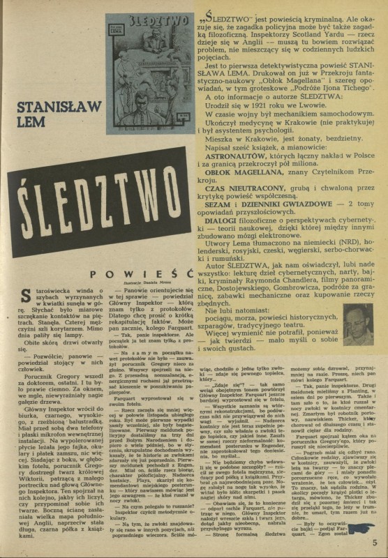 Archiwum / Opowiadanie nr 698 (34/1958) 13/33 Podziel się Tytuł Śledztwo Autor Stanisław Lem Kategoria Opowiadanie Artykuł z numeru 698 (34/1958) Data wydania 24 sierpnia 1958