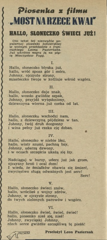 Archiwum / Film nr 688 (24/1958) 06/80 Podziel się Tytuł Piosenka z filmu „Most na rzece Kwai” Autor Leon Pasternak Rubryka Film Artykuł z numeru 688 (24/1958) Data wydania 15 czerwca 1958 Tagi piosenka z filmu Most na rzece Kwai