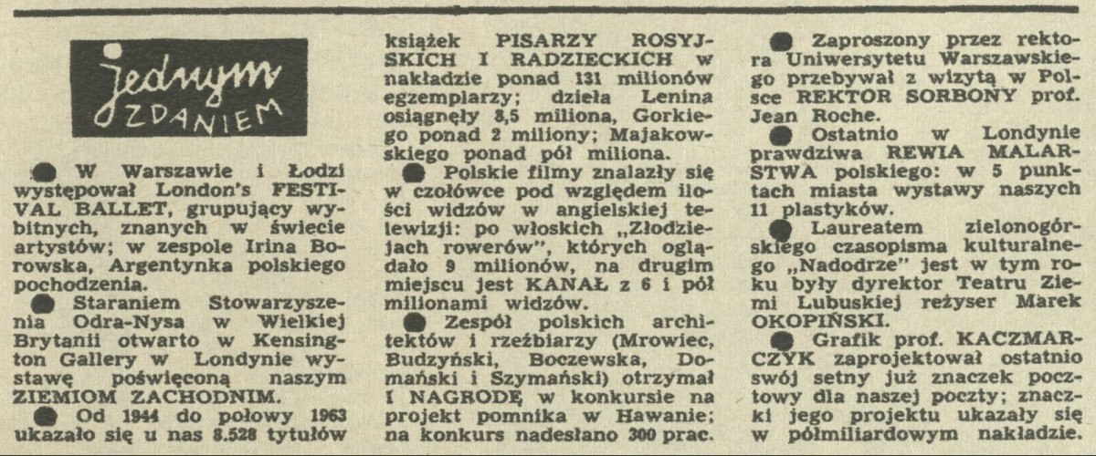 Archiwum / Jednym zdaniem nr 967 (42/1963) 02/13 Podziel się Tytuł Jednym zdaniem Rubryka Jednym zdaniem Artykuł z numeru 967 (42/1963) Data wydania 20 października 1963 Tagi London's Festival Ballet rewia malarstwa poskiego w Londynie różności