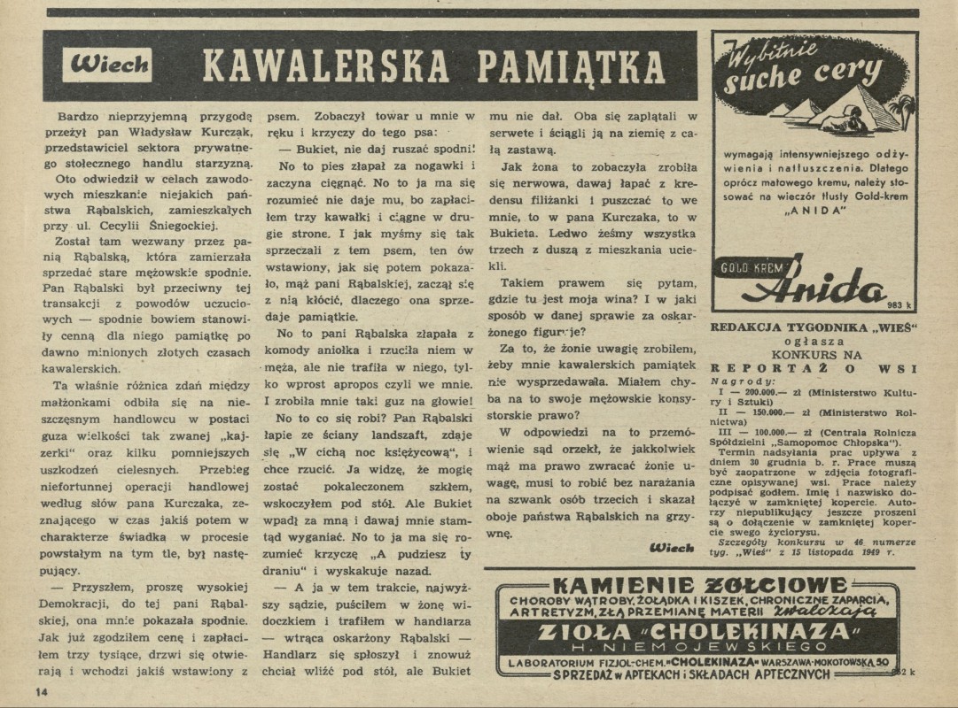 Archiwum / Różności nr 241 (47/1949) 32/894 Podziel się Tytuł Kawalerska pamiątka Autor Wiech Kategoria Różności Artykuł z numeru 241 (47/1949) Data wydania 20 listopada 1949 Tagi felieton Wiech