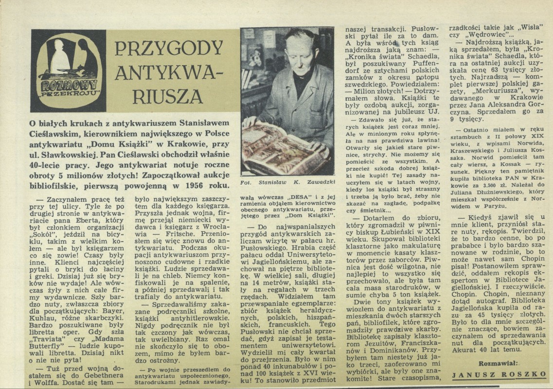 Archiwum / Rozmowy „Przekroju” nr 1395 (01/1972) 56782/123969 Podziel się Tytuł Przygody antykwariusza Autor Janusz Roszko Rubryka Rozmowy „Przekroju” Artykuł z numeru 1395 (1/1972) Data wydania 2 stycznia 1972 Tagi dom książki stanissław cieślawski